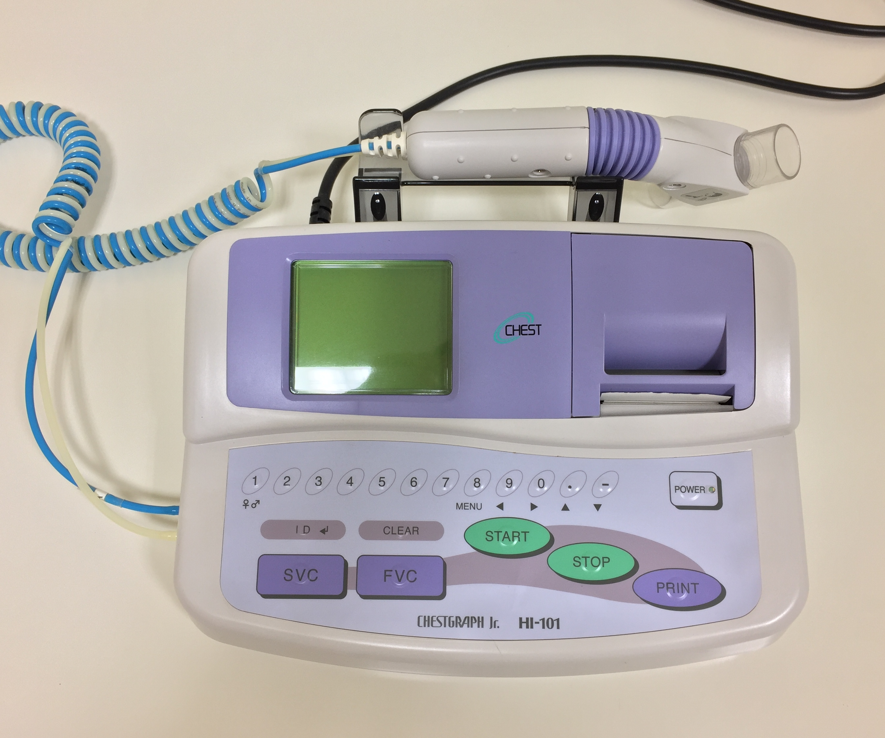 このスパイロメーターは気管支ぜんそくや慢性閉塞性肺疾患(COPD)などの肺の病気の診断や治療効果の判定に使用します。肺年齢を簡単に測定することができます。